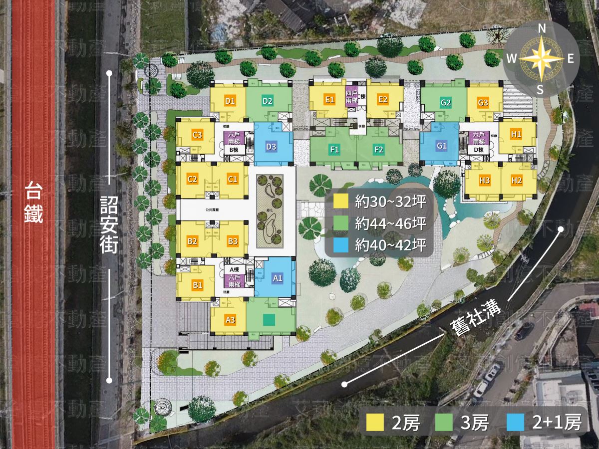 坪數規劃:2房、3房、4房 (H2、H3合併)